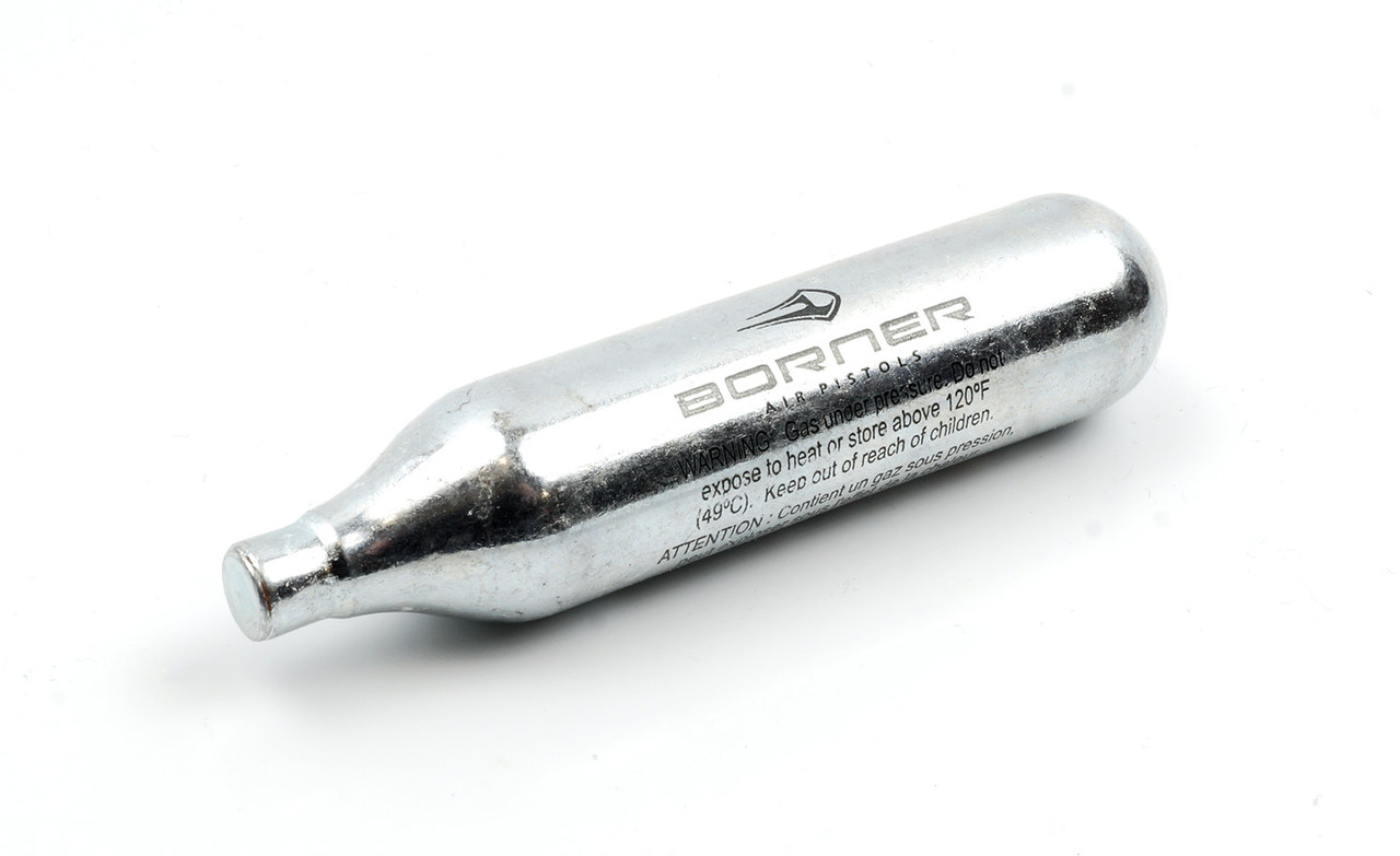 Балончик CO2 компанії BORNER. Переважно використовується в збройові пневматичного типу. Балон заповнений газом СО2 під тиском. Встановлюючи балон у ручка пістолета або магазин, ви проколюєте кришку шийки балона. Газ утримується в системі завдяки клапанам зброї. Під час кожного пострілу газ витрачається дозованими порціями, це зумовлено механізмом пневматичної зброї. Крім газу, у балон під тиском закачана олія. Воно змащує канал дула та механізми під час кожного пострілу. Залишати балон в зброї після стрільби категорично не рекомендується. Зброя, яка не використовується, але лежить у зарядженому стані, може прийти в непридатність, через вплив тиску, газу та оливи на гумки та клапана зброї. У разі якщо ваш пістолет або будь-яка інша зброя почала витравлювати тиск, треба придбати ремонтний комплект і здати зброю в майстерню. Дванадцяти грамів балони СО2 практично ідентичні й підійдуть на будь-який пневматичний пістолет простого типу, або пневматики blow-back (з рухомою затворою).